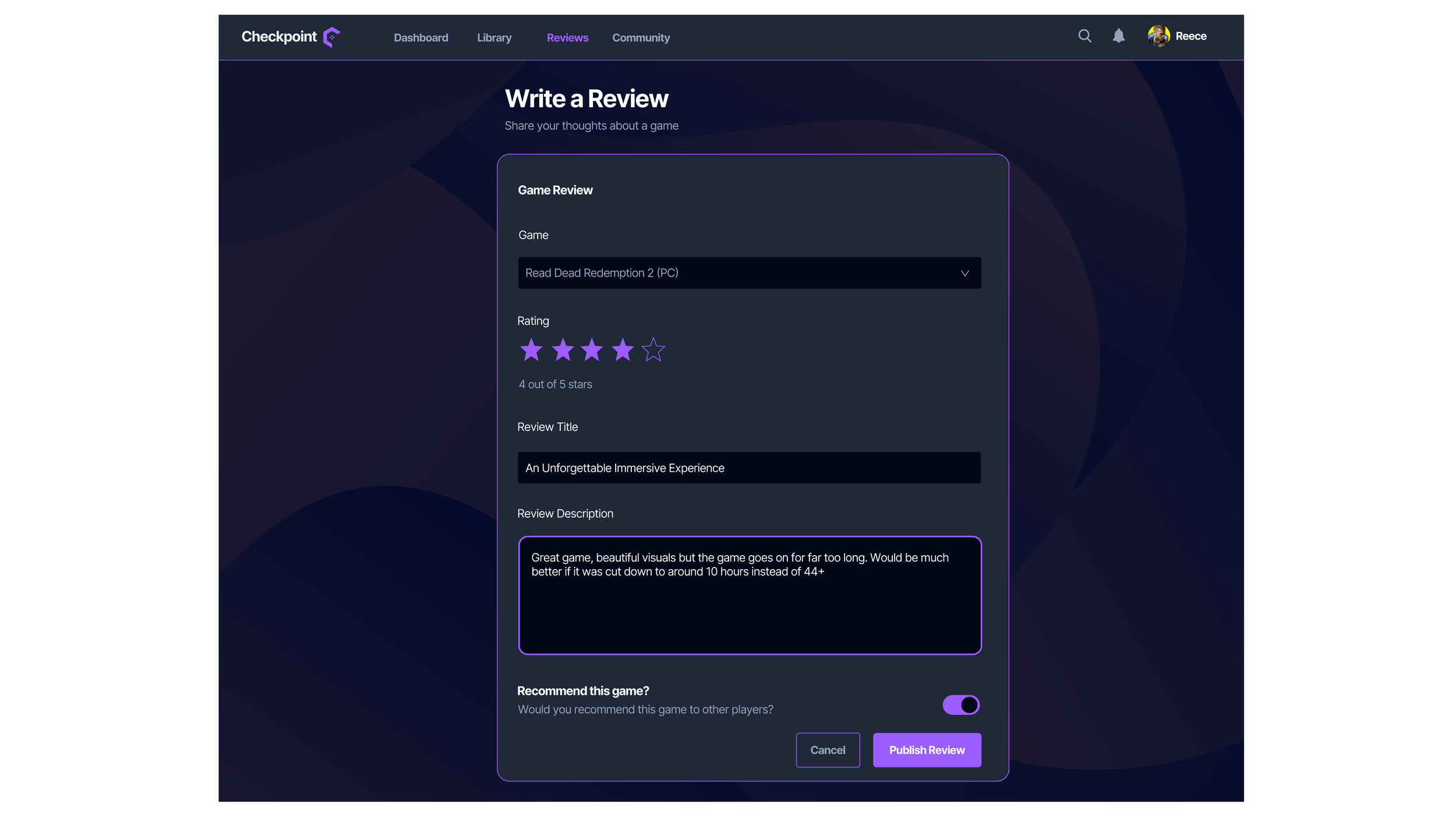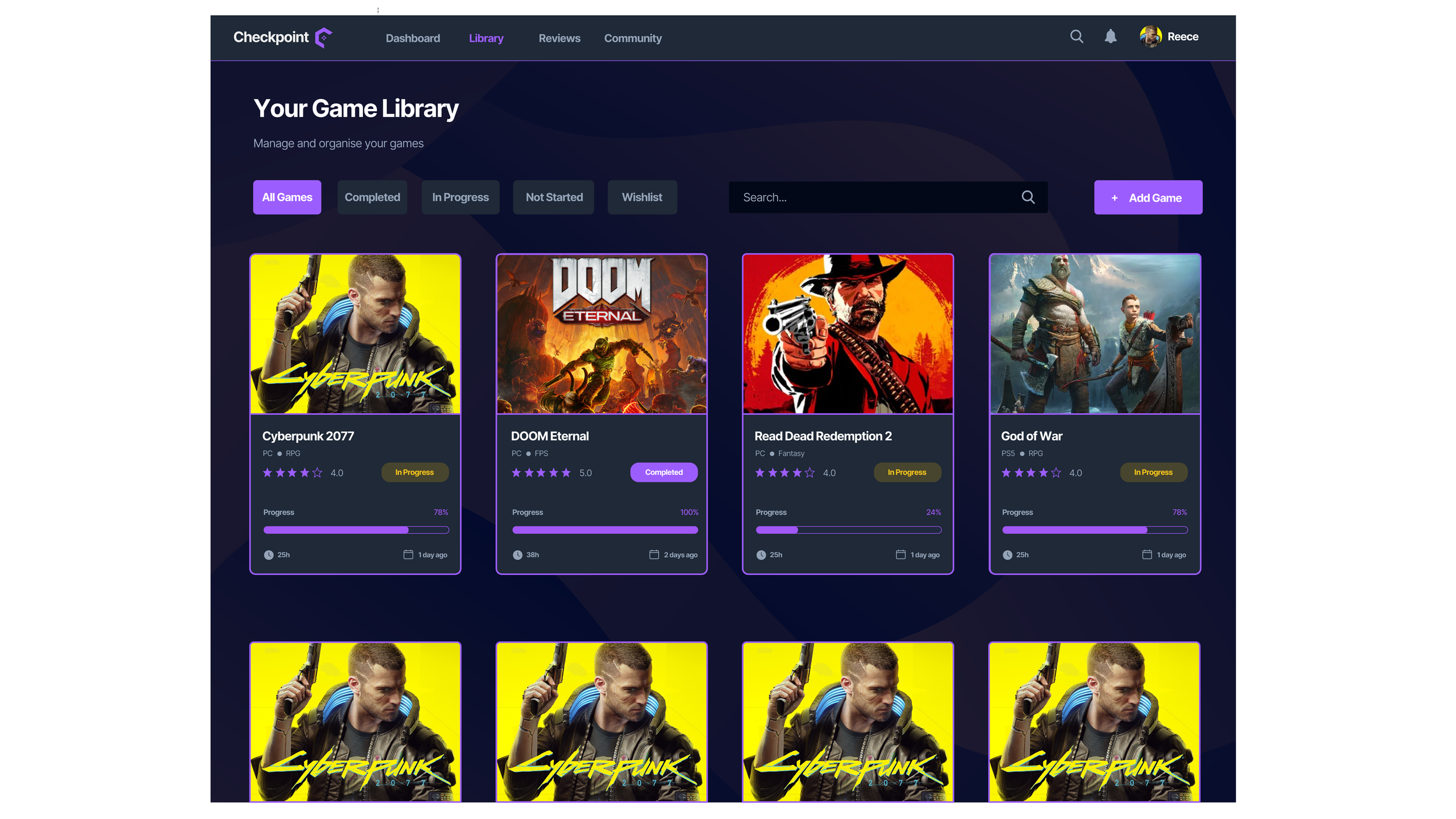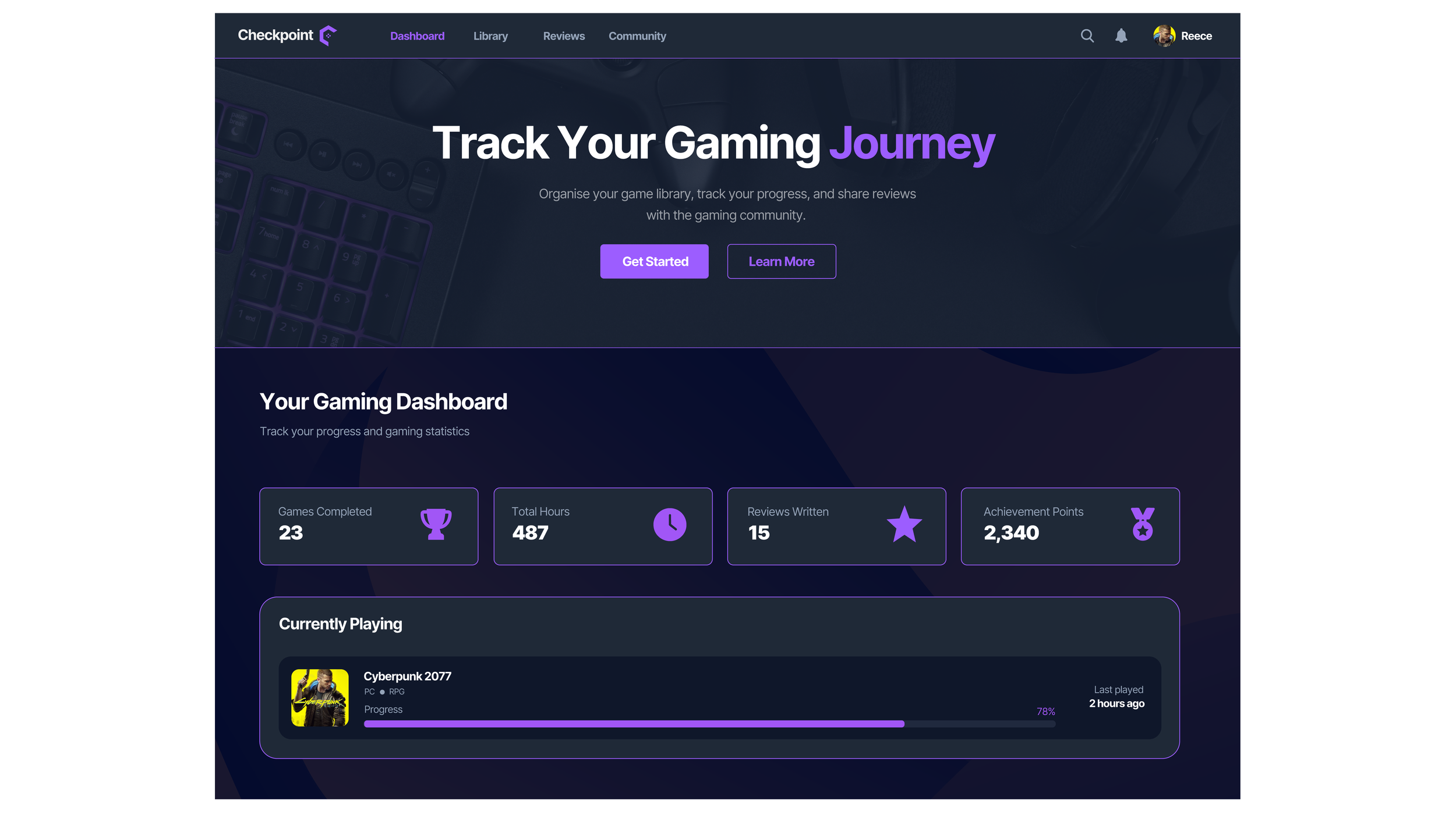Checkpoint needed a website that would ultimately make users want to come back and track their gaming progress to keep tabs on what they have played. Checkpoint also wanted this app to be a one-stop shop for anything gaming related, such as reviews, news, and a place for the gaming community to feel at home.