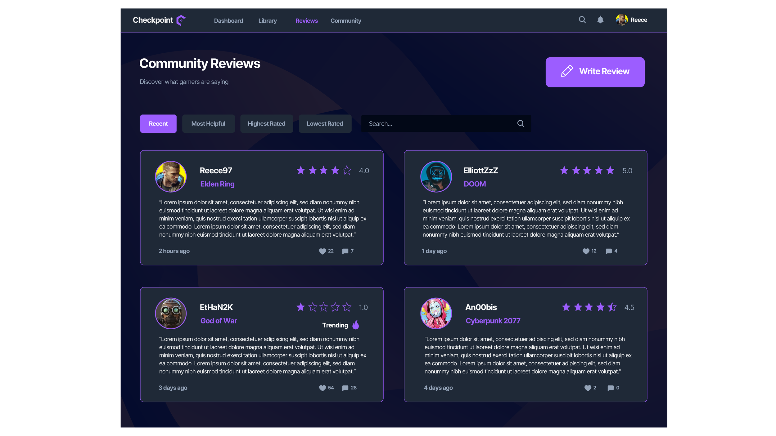 From the community reviews page, users can see what other gamers are saying about the games they’ve played. Because Checkpoint wanted a sense of community built straight into the site, I have added likes and comments to reviews. This helps Checkpoint feel more social and interactive, rather than just simply reading a review off of a critic’s website.